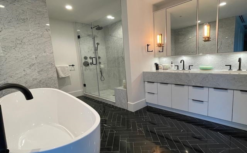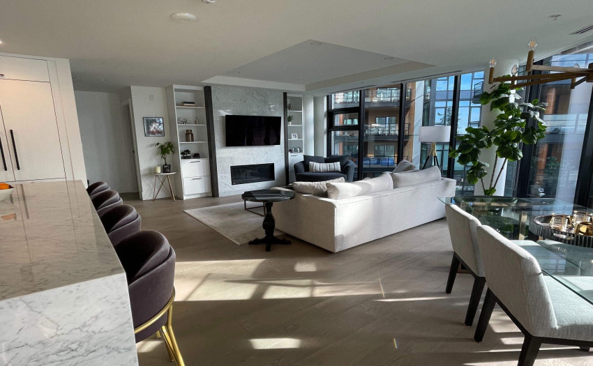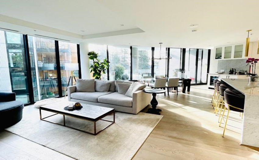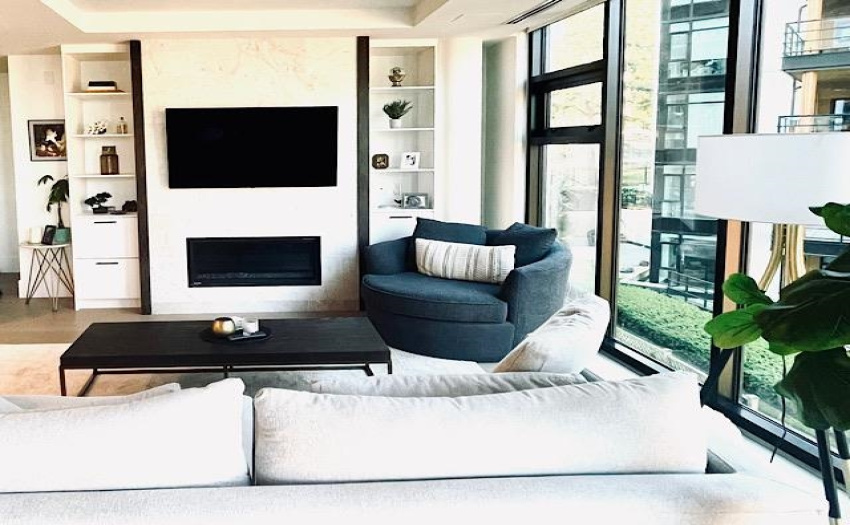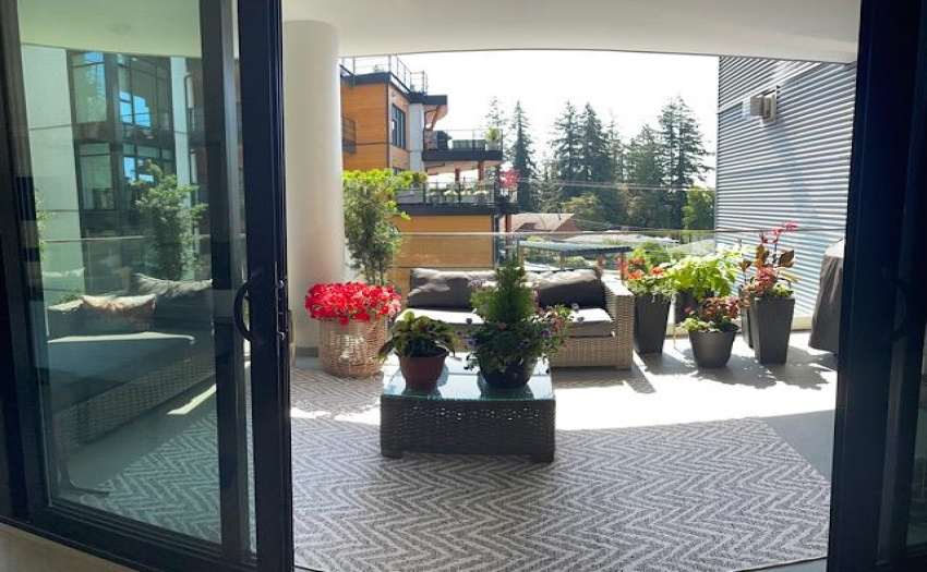 Stunning luxurious condo located in a quiet and central area of White Rock. Easy access to shopping, transit, amenities and West Beach area. Spacious 2 bedroom, 2 bath unit features 2 patios, designer upgrades, gas fireplace, central a/c, marble kitchen counter tops, wine fridge, secluded flex room ideal for home office use. Primary suite features luxurious soaker tub, separate shower, dual sinks, heated tile floor and adjoins a spacious walk-in closet complete with custom drawers and shelving. Access to one of the decks directly from the primary bedroom. The very bright living space features double sliding doors opening onto covered balcony allow fresh air to circulate if a/c not being used.