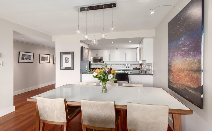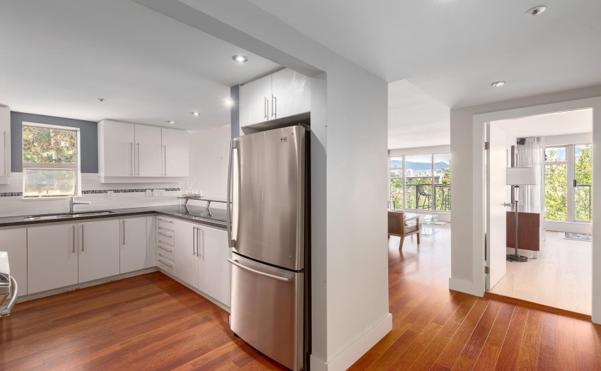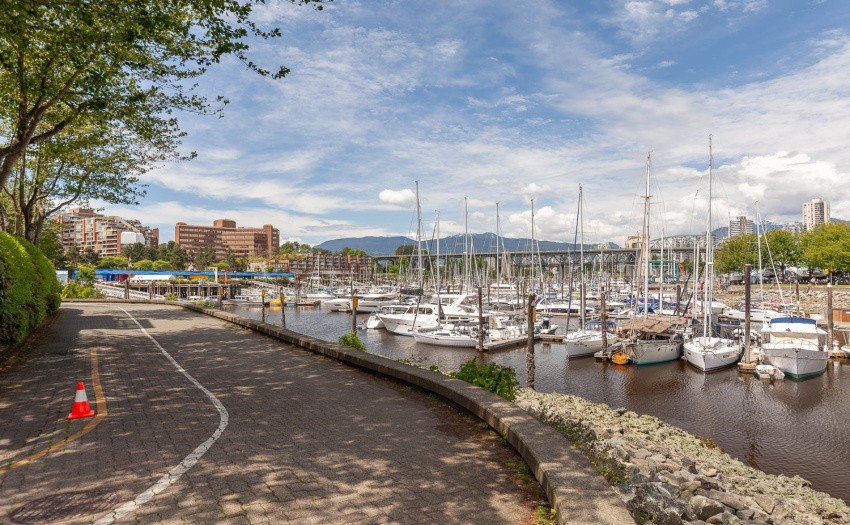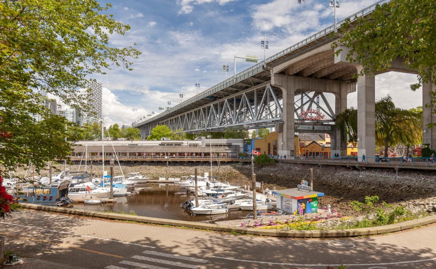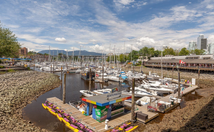 Nestled at the foot of Granville Island and boasting gorgeous views of False Creek, the city & the Northshore mountain, this bright 2 bed/2bath/2 balcony 1500 sq/ft end unit features north, south & west exposures. Large living areas & bedrooms will accommodate all one’s needs. Upgrades throughout from SS appliances & induction stove in the kitchen to granite countertops, custom built-ins, recessed lighting, side by side laundry, upgraded flooring, concrete construction & 1 parking stall. Primary bedroom has a large walk thru closet & ensuite. A separate level entry greets you, rounding off this beautiful must see home. A rare False Creek freehold property offering a carefree/carfree lifestyle just step to the seawall, restaurants, entertainment, shopping & Granville Island public market.
