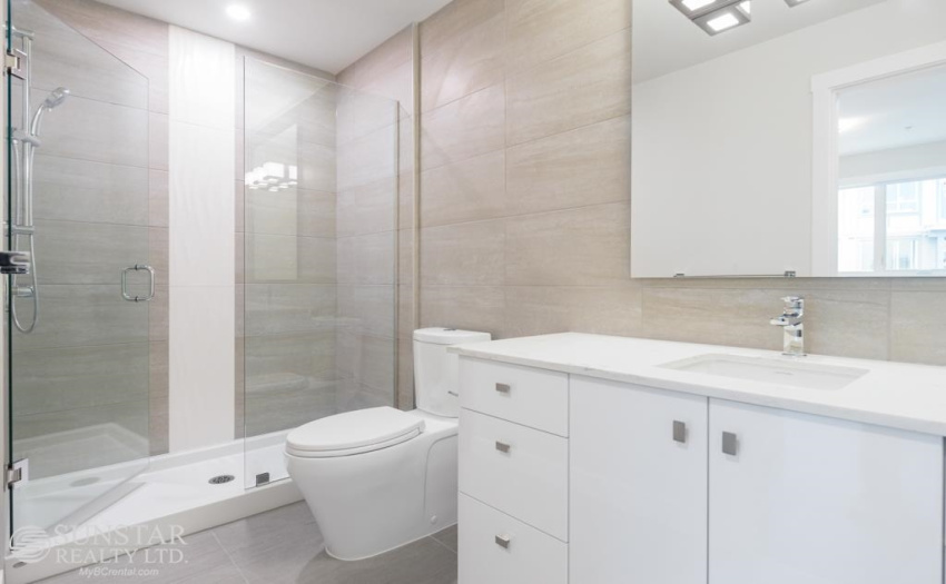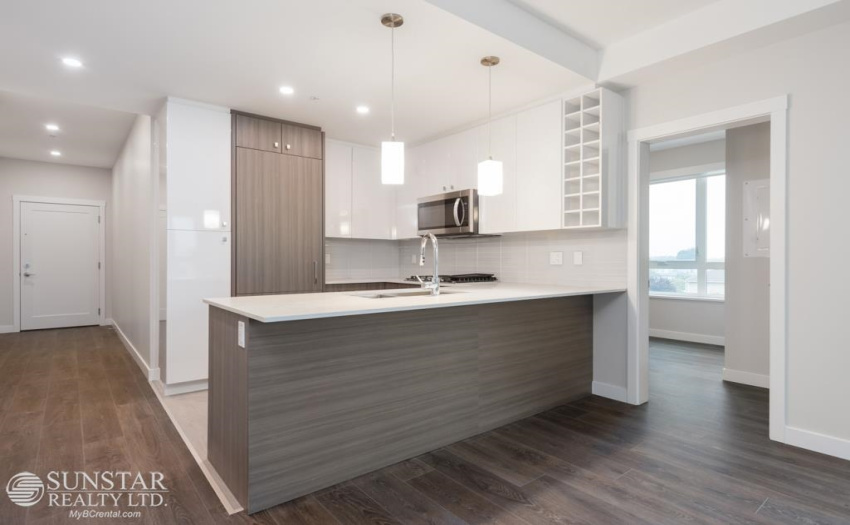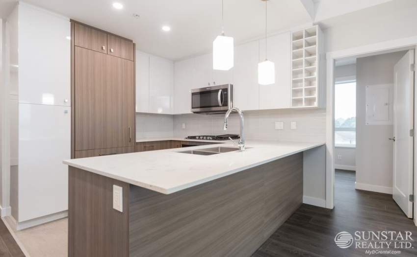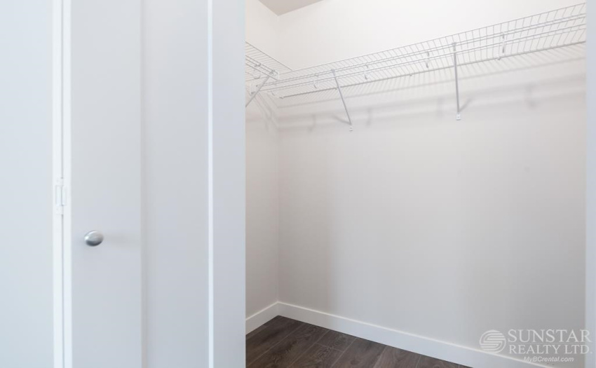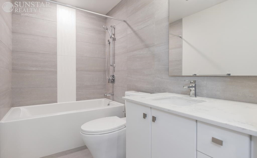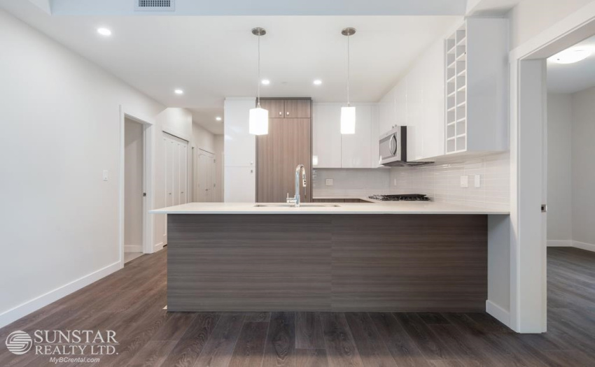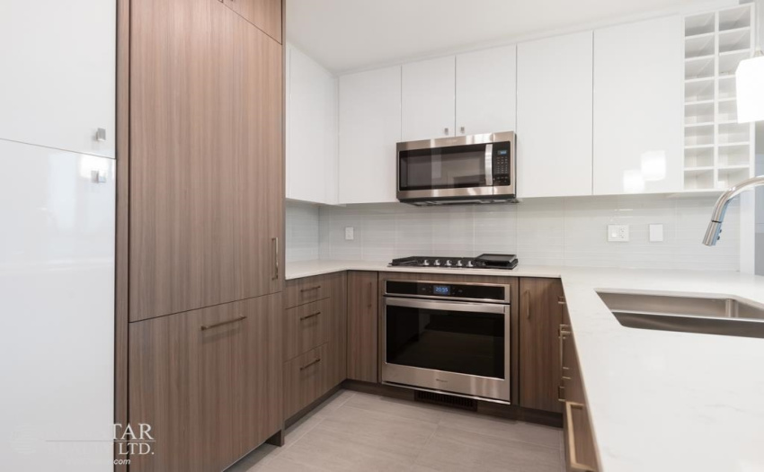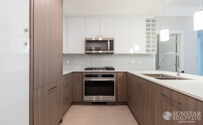 This spacious 980sf, 2 bedrooms + flex room, corner unit, has 9′ ceilings, in-floor radiant heating, wide plank laminate floors and roller shades throughout. Proper foyer takes you to the side-by-side laundry closet and the flex room. The rectangular living and dining room has windows on two sides, and access to a covered balcony. The gourmet kitchen comes with three rows of two-toned cabinets w/ built-in wine rack, soft-close doors and drawers, a serving counter with breakfast bar & pendant lights, integrated fridge & dishwasher, stainless steel gas cooktop, built-in oven, and quartz countertops.