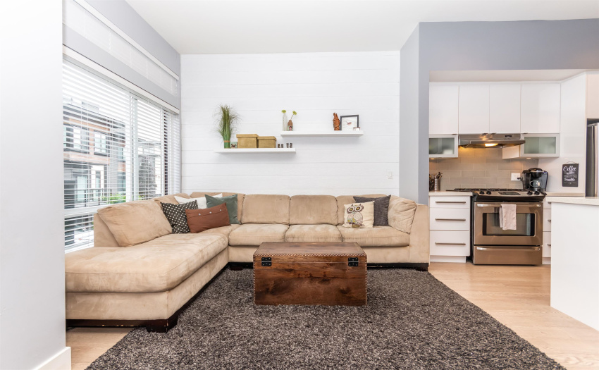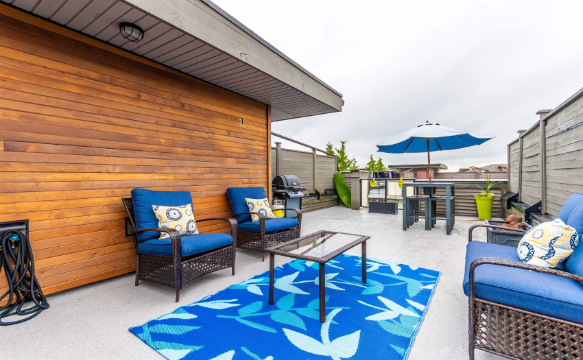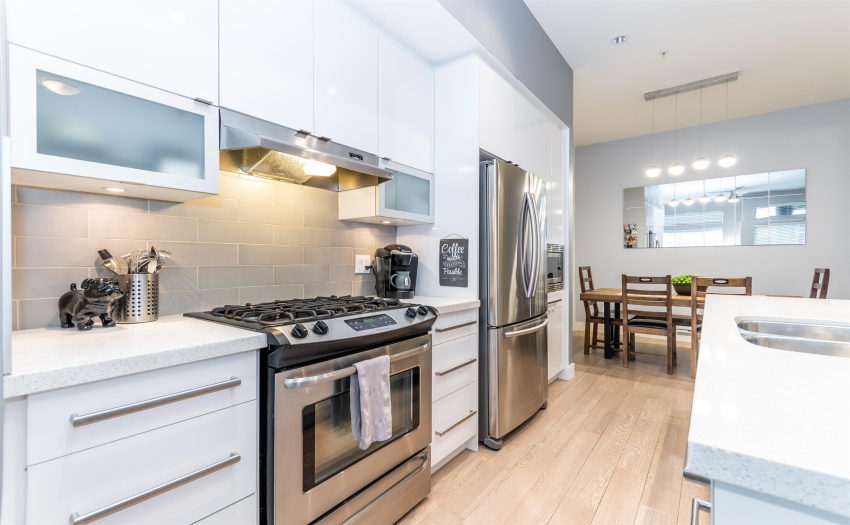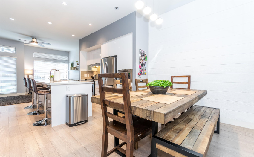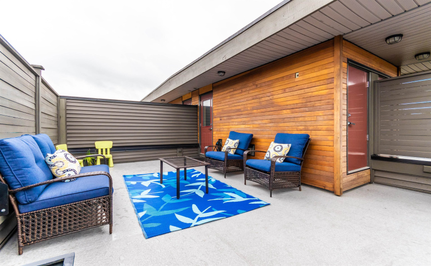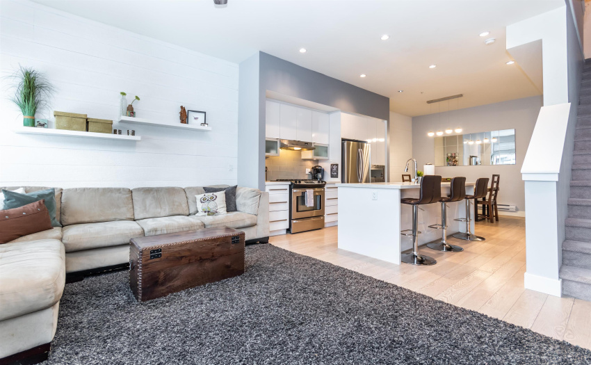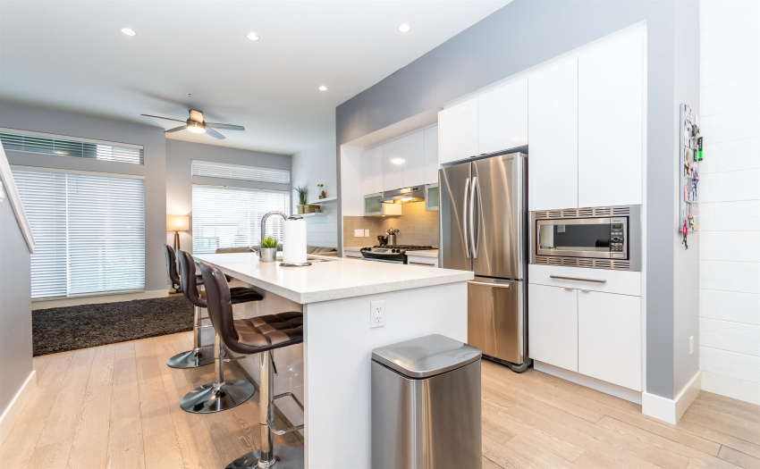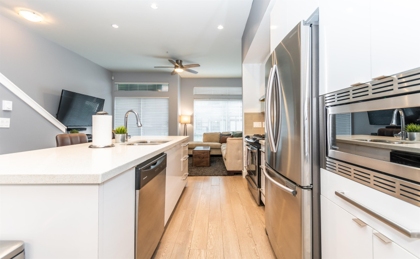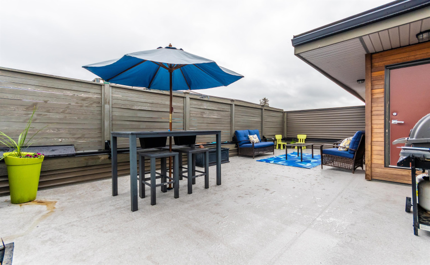 Popular and sought after Exchange complex. If location is important, enjoy shops and restaurants just minutes away – plus gourmet kitchen with quartz countertops, undermount sink, quality stainless steel appliances and large working functional island. Maximum windows for extra light, laminate flooring on the main, 10 ft ceilings for a spacious feel. 2 good size bedrooms up with great ensuite, walk-in closet and massive rooftop private deck and vies!!! Steps away from elementary school. PETS ALLOWED WITH RESTRICTIONS AND RENTALS ALLOWED!! Come see!!