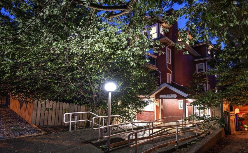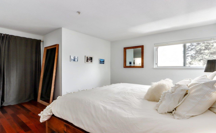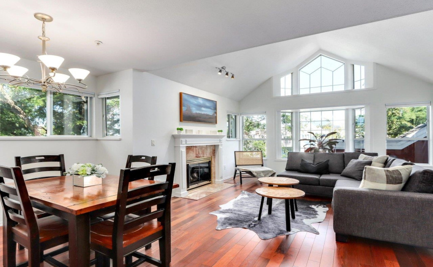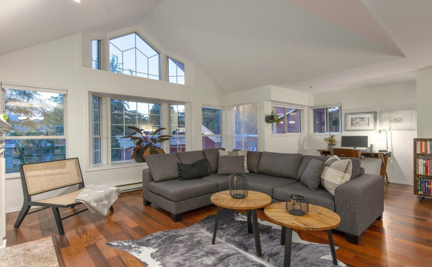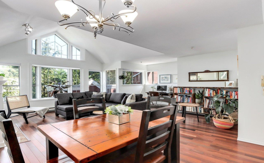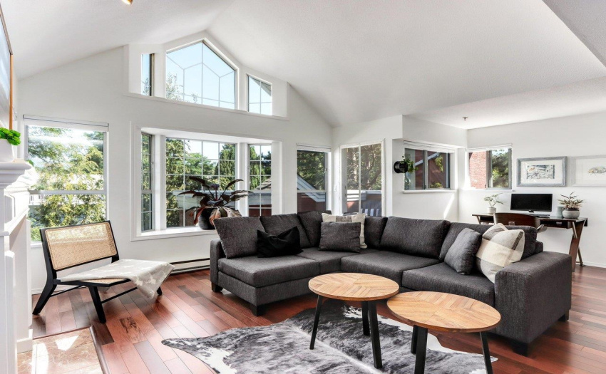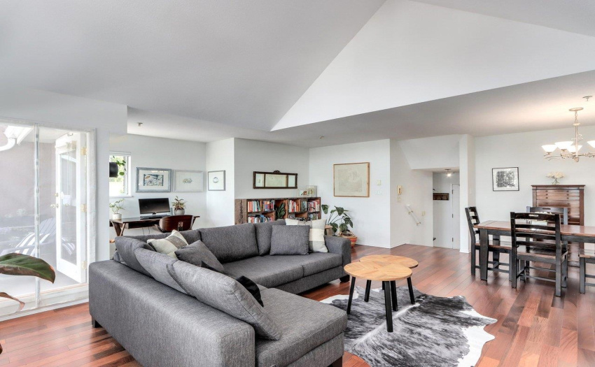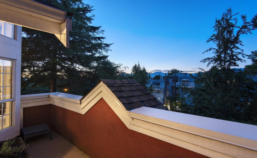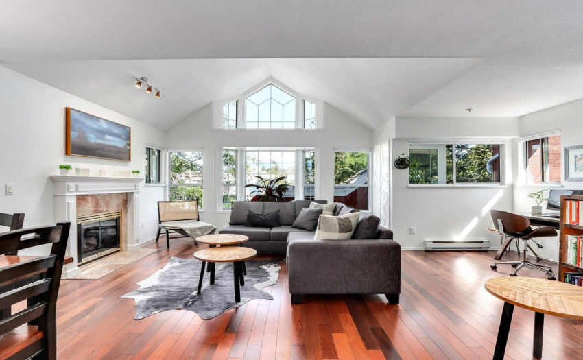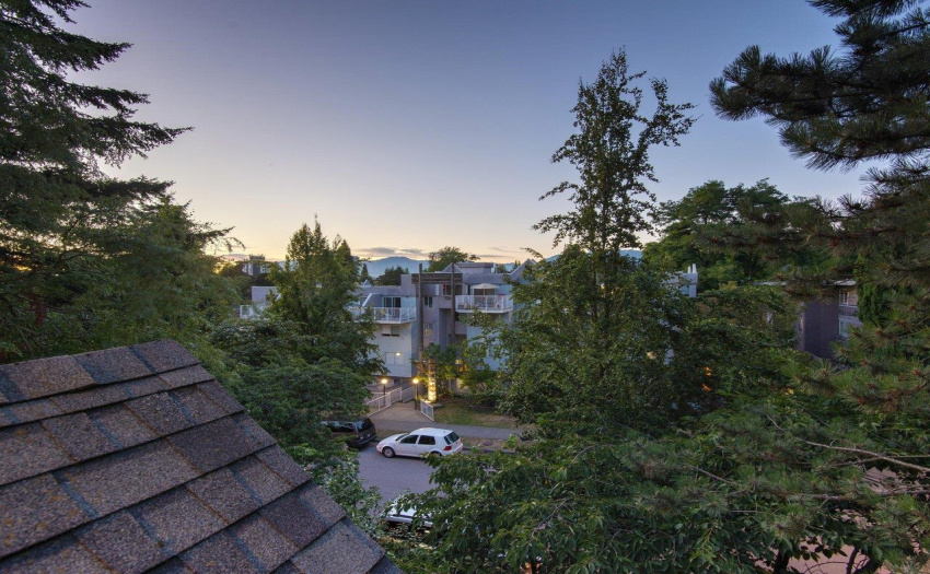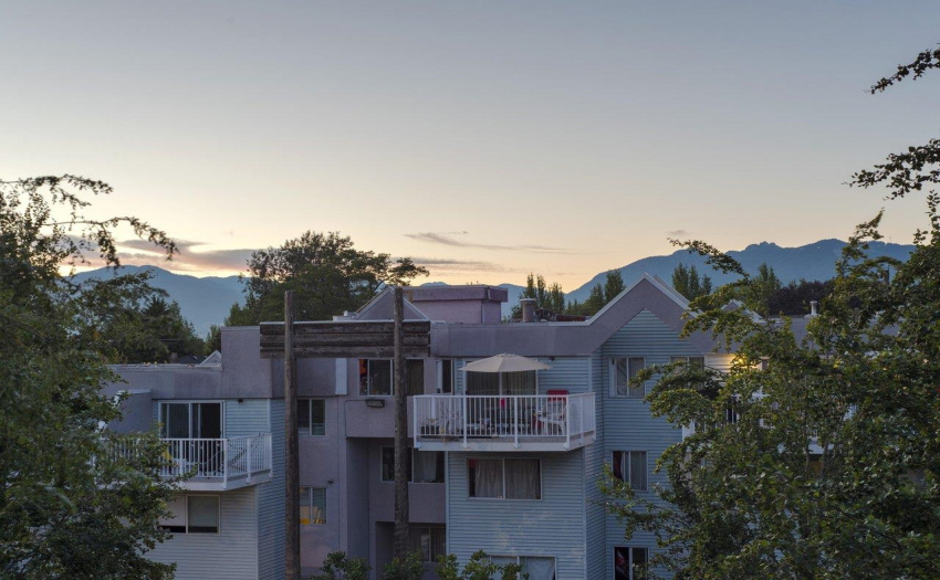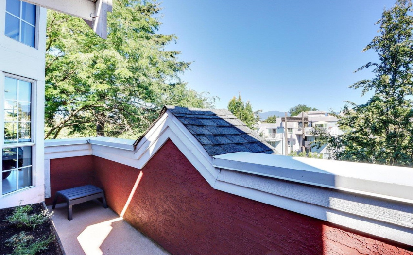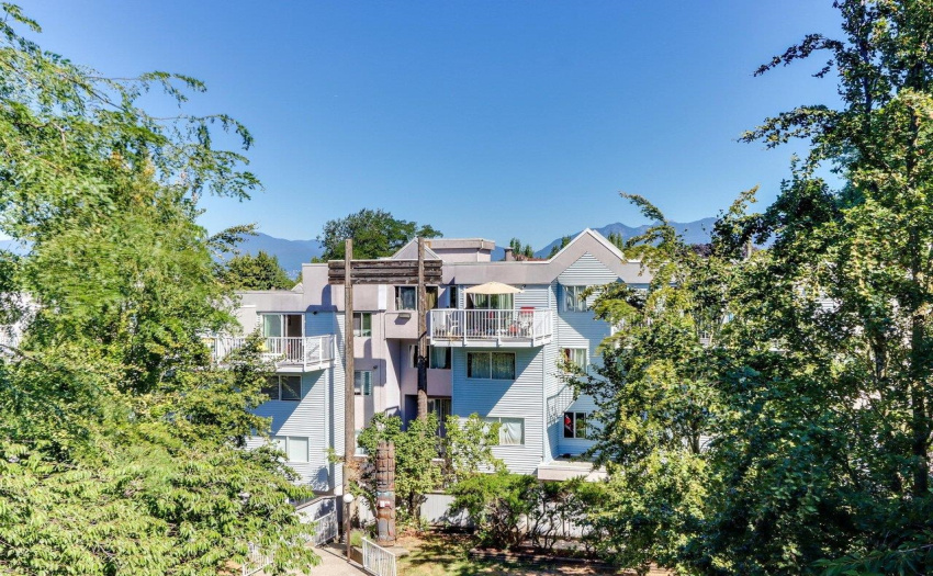 Exceptionally Rare Penthouse home near The Drive. Enjoy sunshine & light throughout this spacious 1055 sq ft, 2 bed 2 bath home. Feel perched on top of the trees & enjoy a huge upper living area, vaulted ceilings, wrap-around windows, mountain views & a private patio to garden or just relax. One of the very best locations near Commercial Drive to access all shops, coffee, food & skytrain, while at the same time enjoying a very quiet tree lined street just a block away from all the action! This boutique building has 10 total suites & only 2 on this top level. Other highlights include hardwood flooring throughout, large bedrooms, gas fireplace, pet friendly, rentals ok,+ parking & storage. Proactive strata & a positive history. Easy to show and view … call your Realtor for showings!
