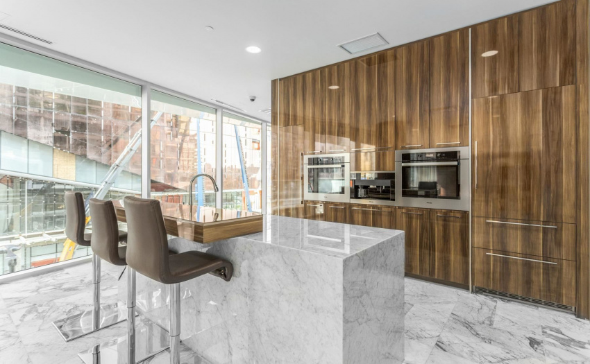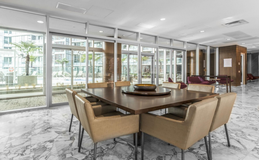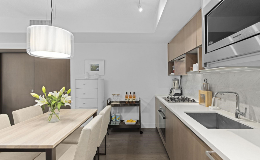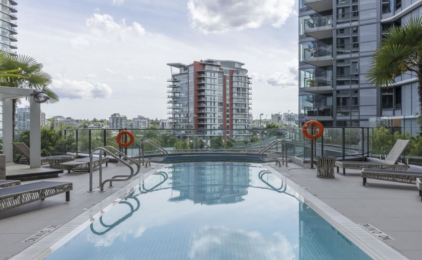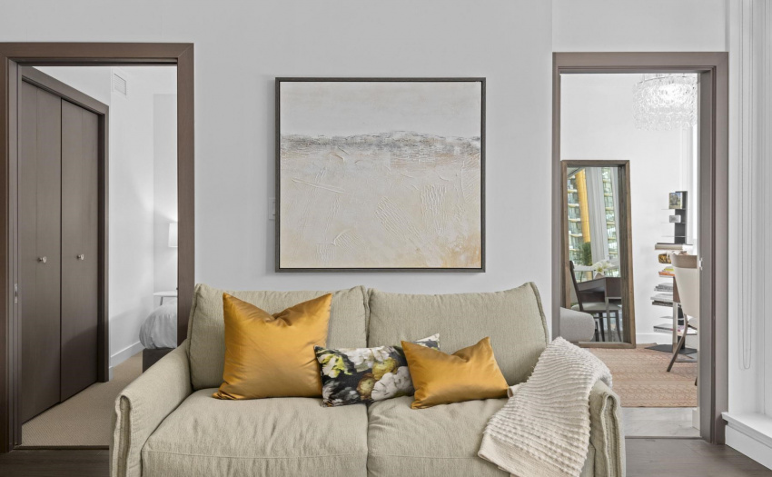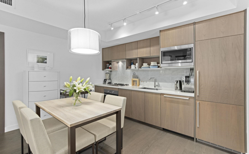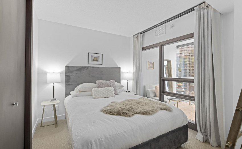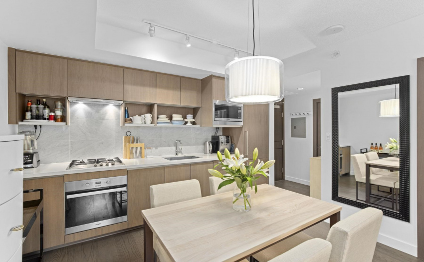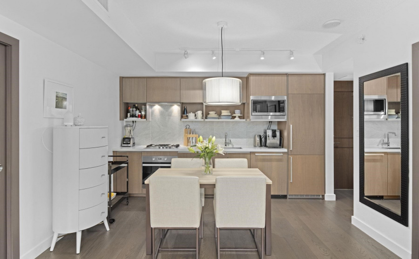 Enjoy some water views and spacious 1 bedroom PLUS solarium PLUS den. This home offers 9′ ceilings, A/C, open efficient layout, wide plank laminate flooring, and extensive use of Marble. Enjoy the luxurious SS GAS Miele appliances, soft close cabinetry & Quartz counter-top. The sun-drenched solarium with large floor to ceiling windows is perfect for a home office. The generous size den with the sliding doors can be used as a guest room. Ultra convenient location, at the center of the city’s sports & entertainment district & steps to world class dining & shopping in Yaletown/False Creek. Marinaside, schools. COVID-19 showing protocol in place, must wear masks. One parking included.