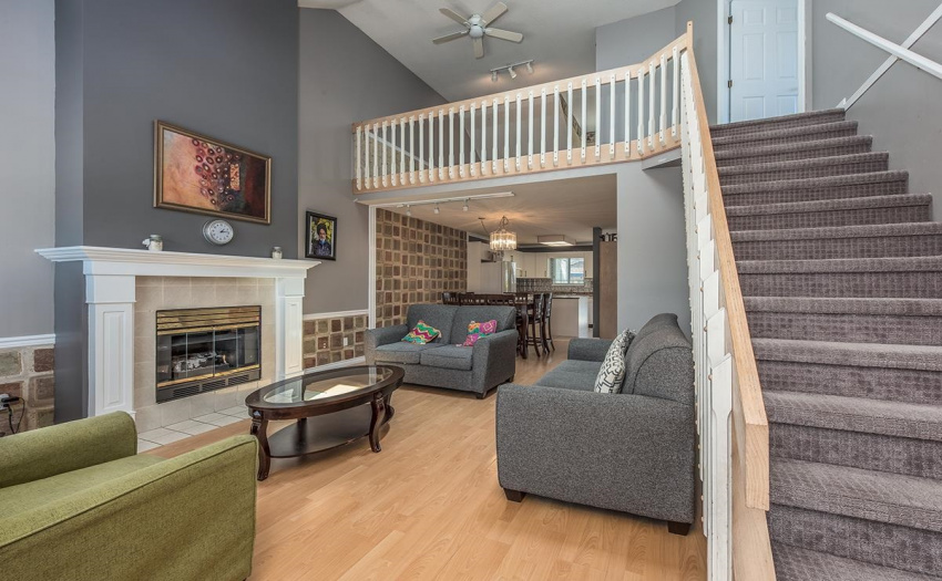 Welcome to this gated complex in Berkshyre Gardens! Here you will find this fabulous loft-style 3 bedroom, 2 bathroom townhouse. You will fall in love with the character, as its been updated with new paint, carpets and blinds. A wonderful natural gas fireplace sits in the living room with massive vaulted ceilings and an open layout. Relax and unwind with your private backyard so close to the clubhouse and garden. This location is truly unbeatable, as you are steps to shopping, entertainment, schools and transit. Ideal for a growing family, or an investment. The options are endless. Act fast!