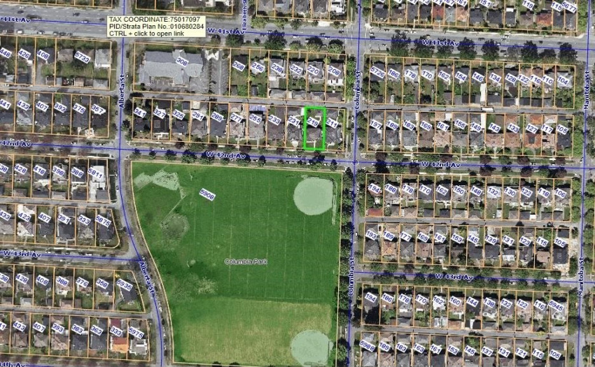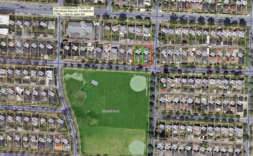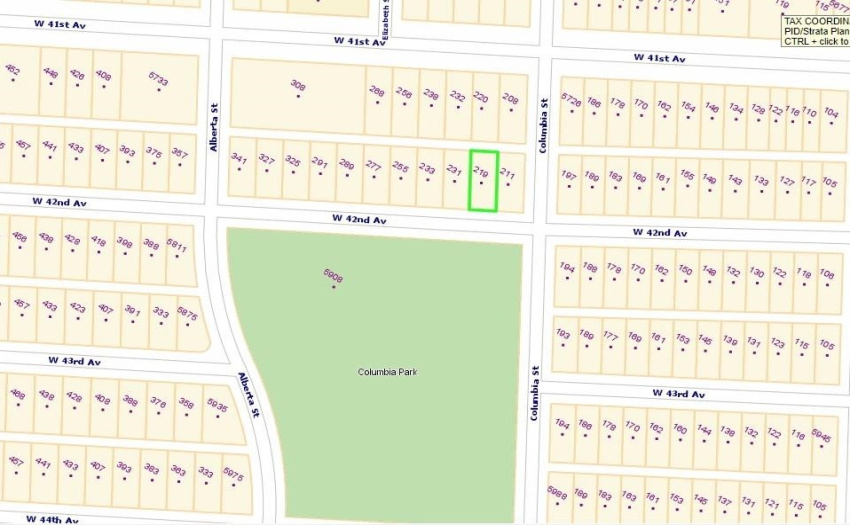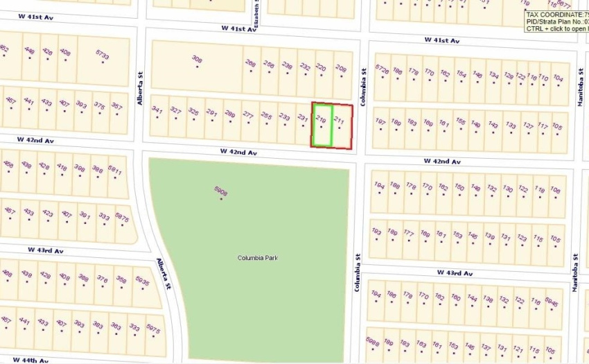LOCATED DIRECTLY across from COLUMBIA PARK! Great opportunity in OAKRIDGE AREA for this Development site with 2-2.5 FSR Cambie Corridor plan zoning for 4-6 storey building on W.42nd Ave and Columbia St. TWO LOT ASSEMBLY. Sold in conjunction with Corner Lot, 211 W.42nd Ave. Total Site is almost 13,000 Square Feet. Prestigious Westside Oakridge Location, close to Skytrain, Oakridge mall, shops and restaurants. Mins from Langara Golf Course & Queen Elizabeth Park. School catchment French Immersion General Gordon Elementary and Churchill Winston Secondary, Sir William Van Horne, Eric Hamber schools. Investors/developers Alert.