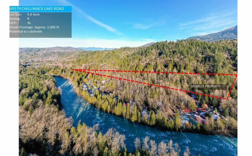 This 9.4 Acre property is a gem along Chilliwack river, a lot opportunities to potentially use it as your own fairyland and leisure paradise or potentially developed into multiple residential lots! Outdoor activities around, hiking, drifting, Camping …. Approximately 2,000 ft of frontage along main road to provide amazing exposure! Mostly level land with breathtaking mountain views!!! This land opportunity is awaiting your imagination! a lot flexibilities. Checkout video in virtual tour!