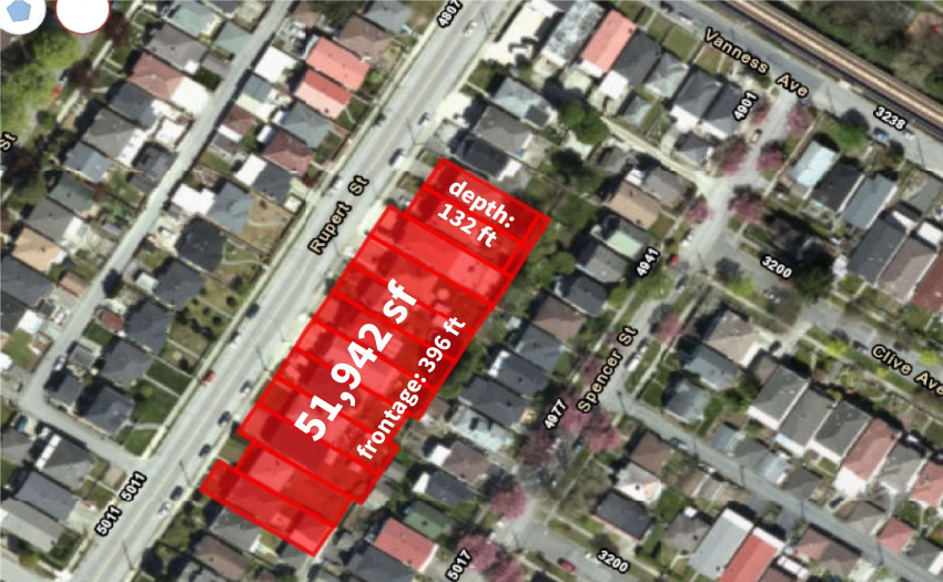 MARKET RENTAL PROJECT / HIGH DENSITY SENIOR HOUSING PROJECT SALE: 12 consecutive houses in a row from 4908 – 5004 Rupert selling as land assembly in vibrant Joyce-Collingwood Area. Lot size: 51,942 sf, Frontage: 396 sf, Depth: 132 sf. Central location, close to transits, schools, Joyce Skytrain Station, Metrotown, parks and Shopping malls. This site is within City of Vancouver Secured Rental Policy, can be built MARKET RENTAL BUILDING or high density senior housing, POTENTIAL TO INCREASE FSR, great for investors and developers. Site can be sold partially or in a whole parcel. Please do your feasibility study, do not walk through property, do not bother occupants! Call to inquire!